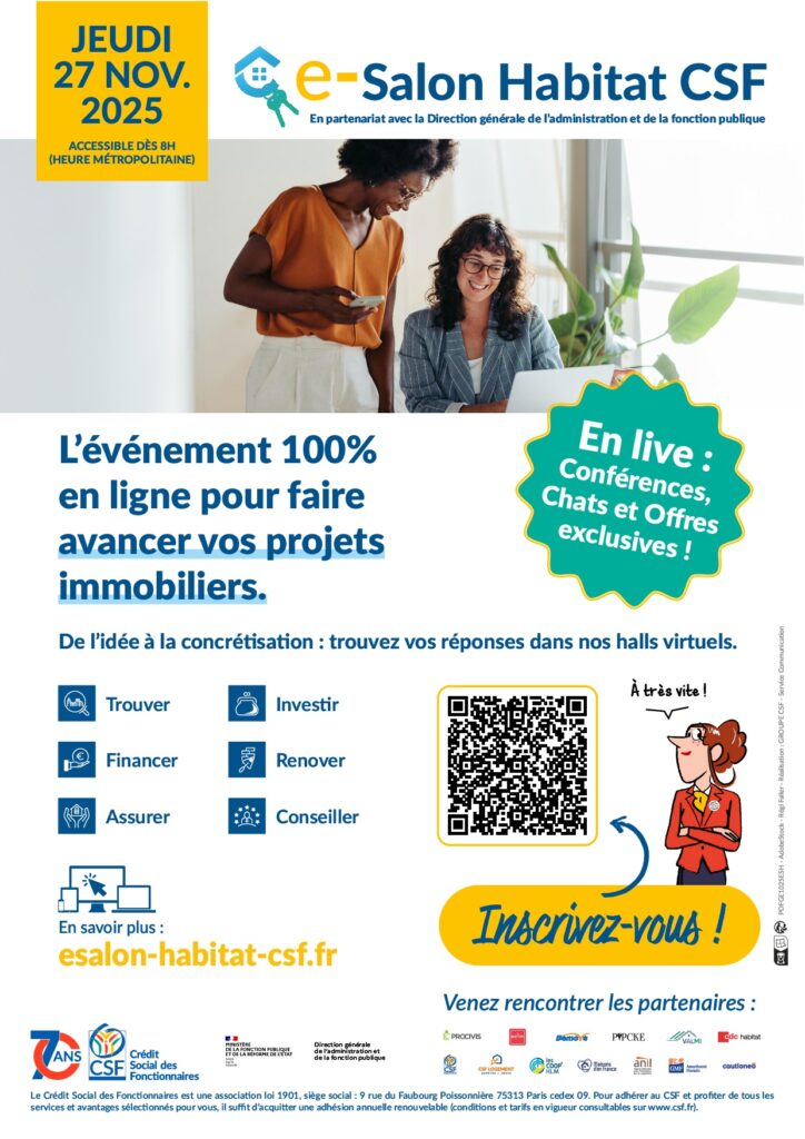 Le 27 novembre 2025, le Crédit Social des Fonctionnaires(CSF) organise, en partenariat avec la Direction générale de l’administration et de la fonction publique (DGAFP), le 1er e-Salon Habitat, un rendez-vous 100 % en ligne dédié à l’immobilier et au logement.
